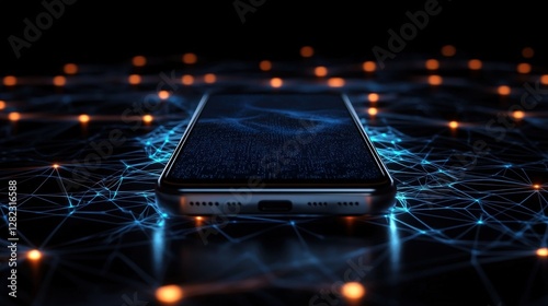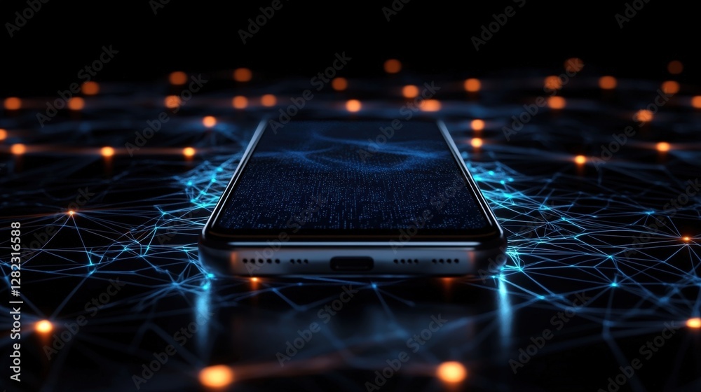 Wall mural futuristic smartphone displaying transforming data stream laying on network of connected dots repres - Wall murals Wall mural futuristic smartphone displaying transforming data stream laying on network of connected dots repres - Wall murals