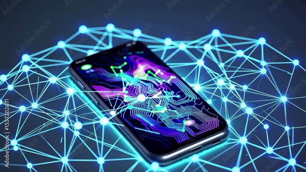 Wall mural futuristic smartphone featuring a vibrant interface with lines and dots, connecting to a vast networ - Wall murals Wall mural futuristic smartphone featuring a vibrant interface with lines and dots, connecting to a vast networ - Wall murals