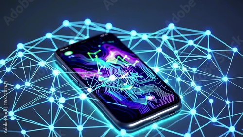 The watermark will not be included on Wall mural.: Futuristic smartphone featuring a vibrant interface with lines and dots, connecting to a vast networ