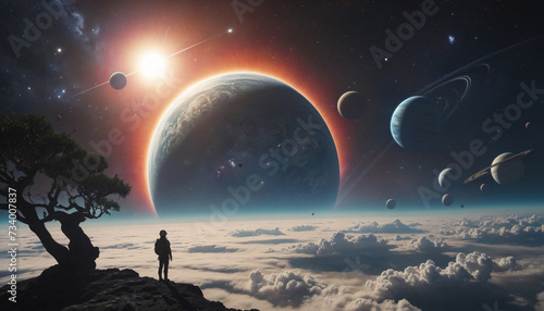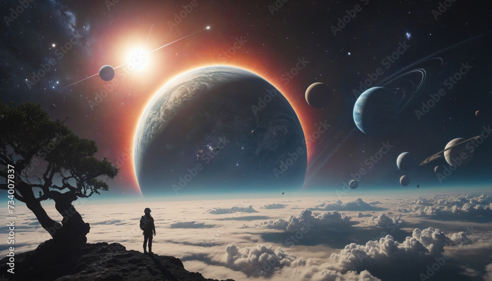 Wall mural futuristic space landscape with planets and space objects on clouds