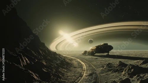 Wall mural : Futuristic spaceship landing on an unexplored planet with visible tire tracks on the ground, rings a