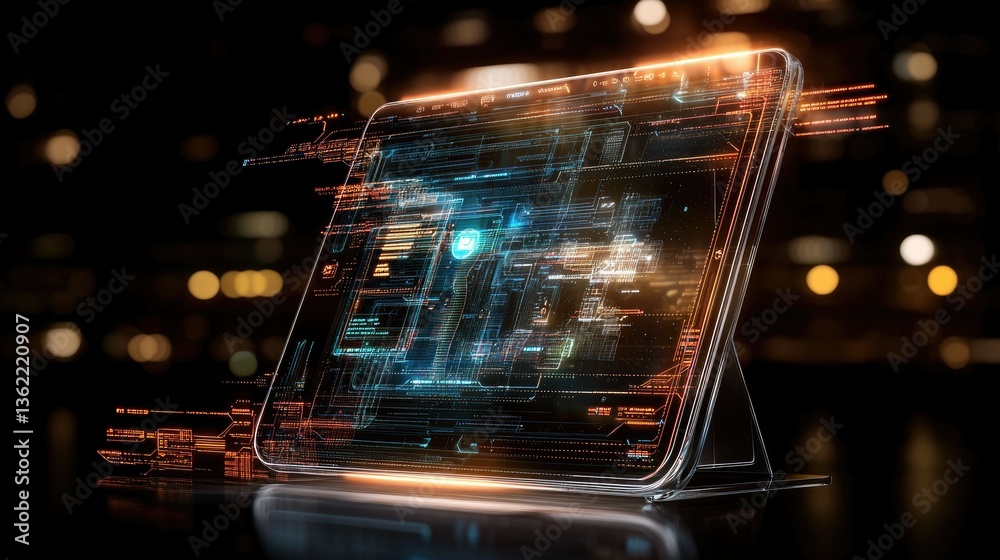 Wall mural : Futuristic tablet displaying complex digital data streams