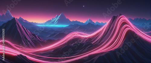 The watermark will not be included on Wall mural.: Futuristic three-dimensional neon landscape with dynamic lines in motion, creating a surreal panoram