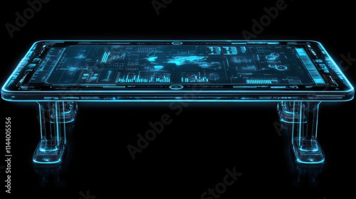 The watermark will not be included on Wall mural.: Futuristic transparent table with holographic display showing data -