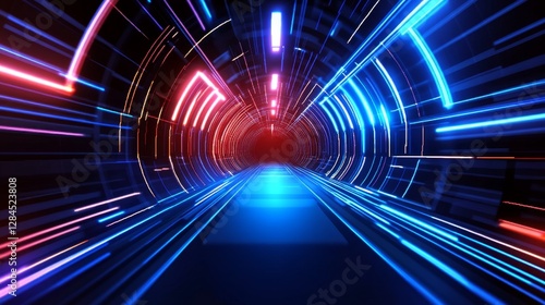 The watermark will not be included on Wall mural.: Futuristic tunnel with vibrant blue and red light creating a dynamic motion effect