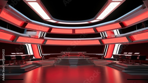 The watermark will not be included on Wall mural.: Futuristic tv game show studio design with an interview table on stage -