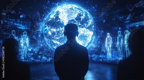 Futuristic virtual reality conference with holographic globe visualizing global communication technoWall mural