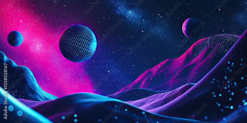 The watermark will not be included on Wall mural.: Futuristic website ui with space-inspired elements, including holographic buttons, celestial data gr