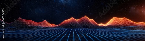 The watermark will not be included on Wall mural.: Futuristic wireframe landscape with sharp geometric structures, glowing 3d shapes, and intricate gri