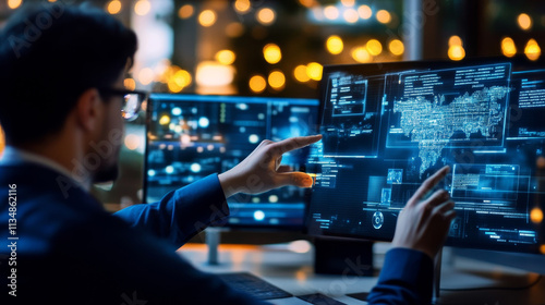 Wall mural futuristic workspace holographic display interface - modern programmer interacts with holographic da - Wall murals Wall mural futuristic workspace holographic display interface - modern programmer interacts with holographic da - Wall murals