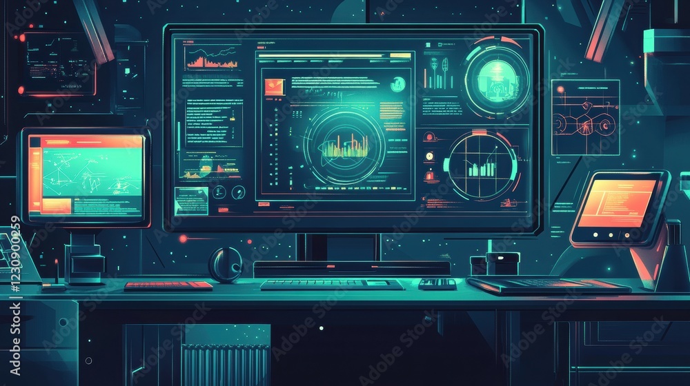 The watermark will not be included on Wall mural.: Futuristic workspace with high-tech monitors and digital interface