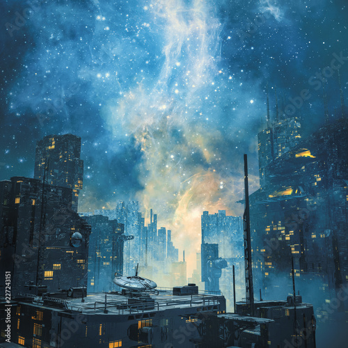 Galactic space colony by night / 3d illustration of dark futuristic science fiction city under a gloWall mural