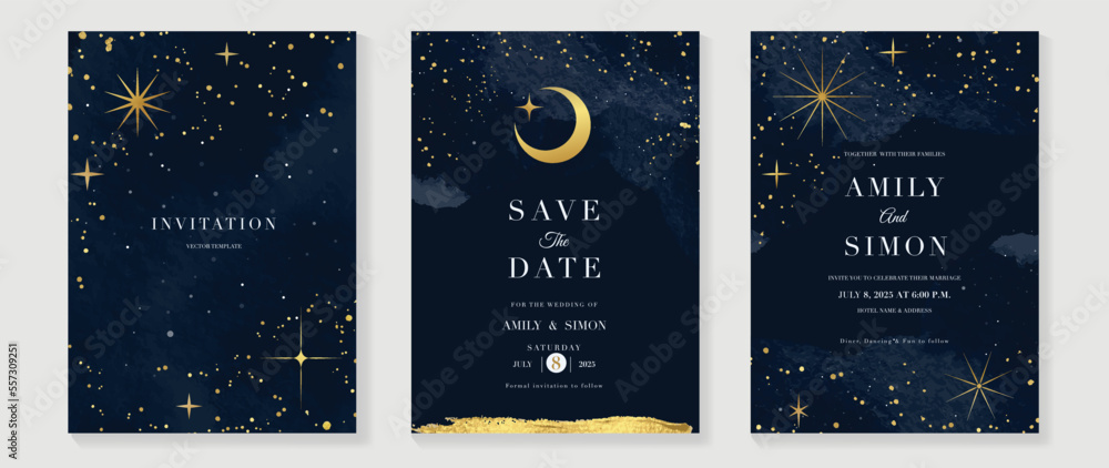 Galaxy themed wedding invitation vector template - collection of luxury save the date card with waterWall mural