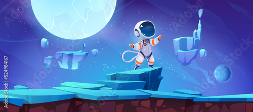The watermark will not be included on Wall mural.: Game level background with cute spaceman on alien planet surface - vector cartoon illustration of gro