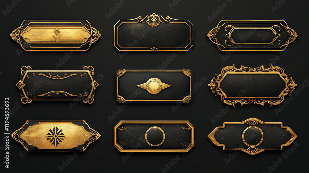Wall mural game ui long button with thin gold frame. rectangular medieval border with golden metal ornament for - Wall murals Wall mural game ui long button with thin gold frame. rectangular medieval border with golden metal ornament for - Wall murals