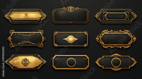 Wall mural game ui long button with thin gold frame. rectangular medieval border with golden metal ornament for