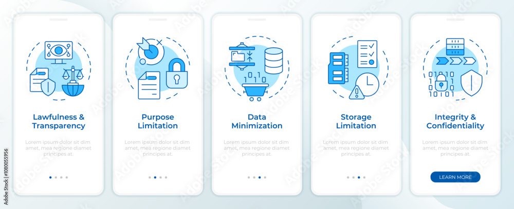 Wall mural : Gdpr principles blue onboarding mobile app screen - data protection - walkthrough 5 steps editable gra