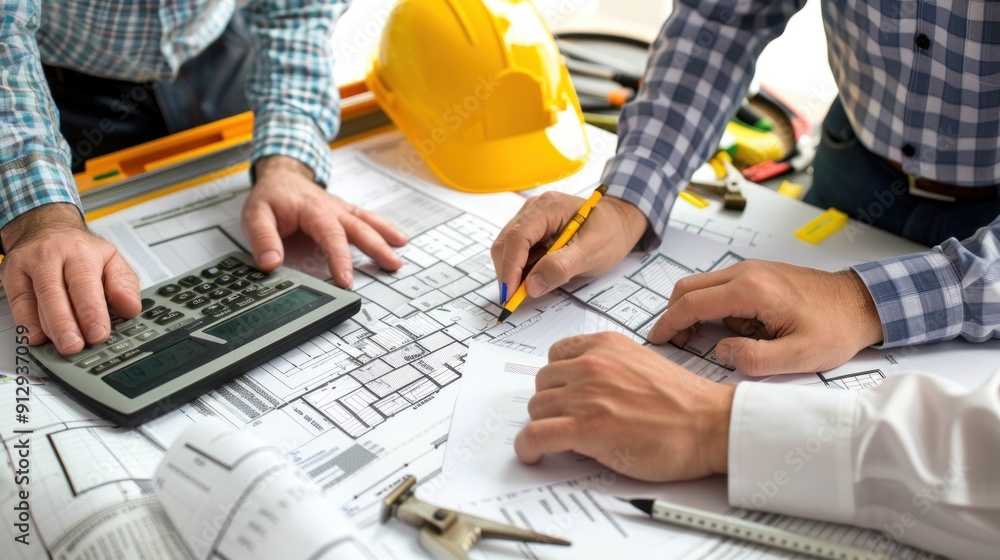 Wall mural generate a photo realistic image of a construction project team analyzing expense reports with detai - Wall murals Wall mural generate a photo realistic image of a construction project team analyzing expense reports with detai - Wall murals