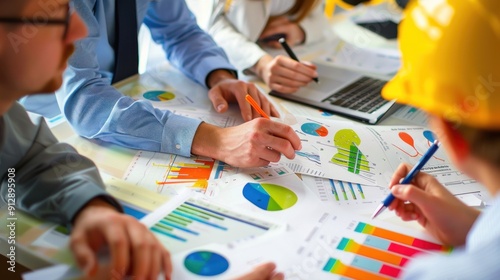 Generate a photo realistic image of a construction project team discussing expense planning strategiWall mural