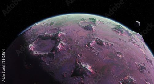 The watermark will not be included on Wall mural.: Generative ai alien planet surface with distant moon planet alien planet moon surface purple craters