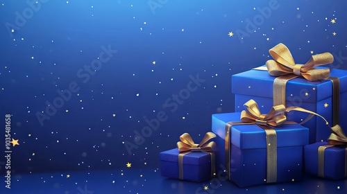 Wall mural generative ai illustration of blue gifts with golden bows and ribbons on blue background with stars