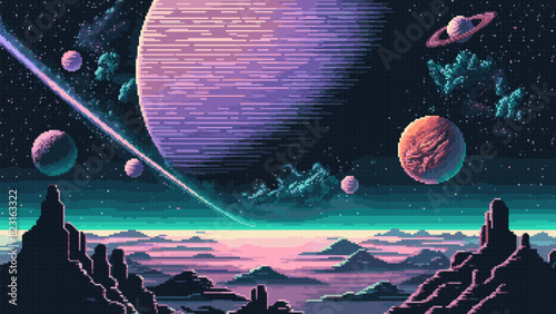 Wall mural generative ai purple or violet space planet surface and galaxy landscape. 8bit pixel art game scene, - Wall murals Wall mural generative ai purple or violet space planet surface and galaxy landscape. 8bit pixel art game scene, - Wall murals