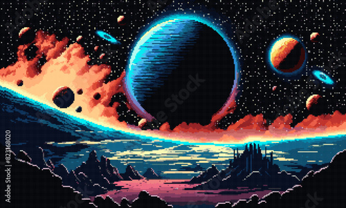 Wall mural generative ai starry galaxy and blue planet surface landscape. 8bit pixel art game scene. retro arca - Wall murals Wall mural generative ai starry galaxy and blue planet surface landscape. 8bit pixel art game scene. retro arca - Wall murals