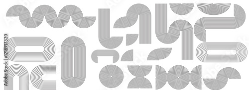 The watermark will not be included on Wall mural.: Geometric abstraction, a collection of minimalist line patterns, featuring curved arcs, concentric c
