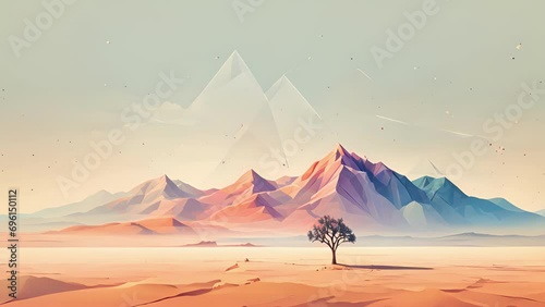 The watermark will not be included on Wall mural.: Geometric minimal illustration of a lone tree in a vast desert with abstract mountains in the backgr