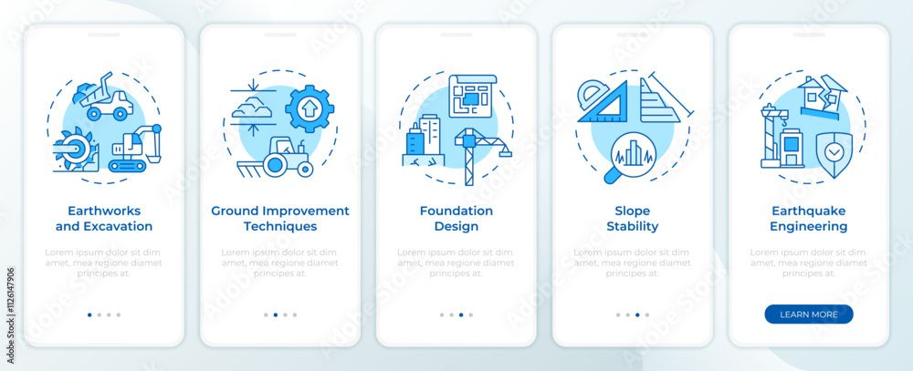 Wall mural : Geotechnical reports blue onboarding mobile app screen - industry walkthrough 5 steps editable graphi