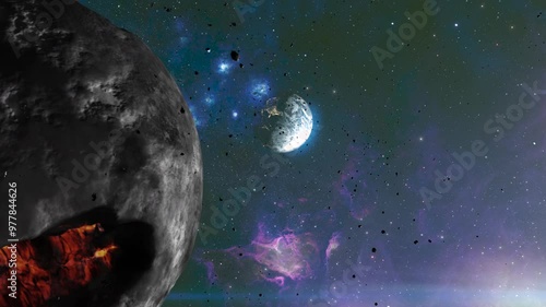 The watermark will not be included on Wall mural.: Giant hot rock asteroid close to earth with small rocks 3d rendering of planet earth with potential