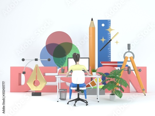 Wall mural : Girl web designer in a working environment - 3d icons and graphic design elements on a white backgrou
