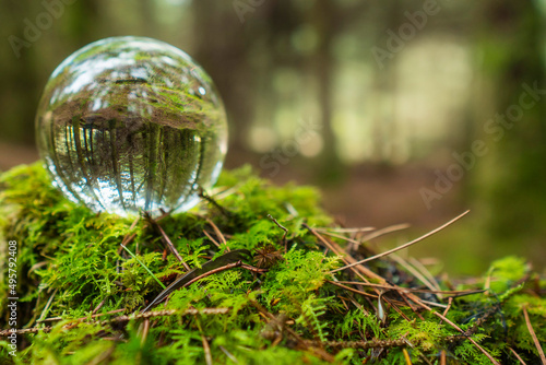 The watermark will not be included on Wall mural.: Glass ball on a moss in a forest - trees reflection - selective focus - nobody - abstract nature backgro