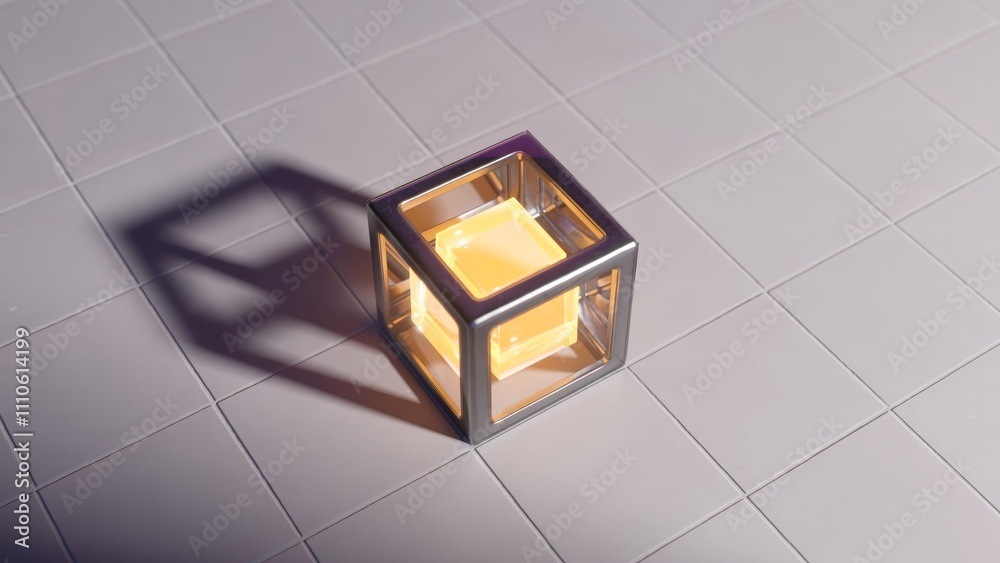 Wall mural : Glass box containing a smaller glowing cube sits on a tiled floor, casting a distinct shadow that ad
