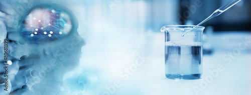 Wall mural glass dropper with water drop in beaker with molecular structure science equipment and artificial in - Wall murals Wall mural glass dropper with water drop in beaker with molecular structure science equipment and artificial in - Wall murals