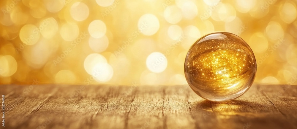 Glass sphere resting on wooden table with shimmering golden bokeh background featuring ample copy spWall mural