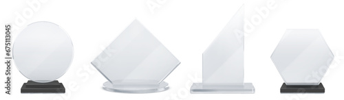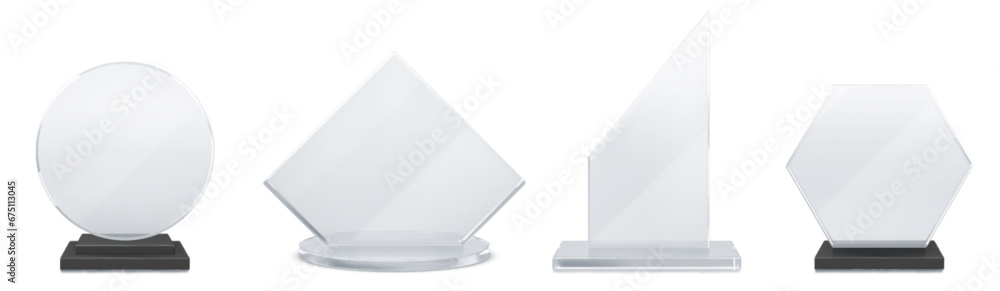 Wall mural glass transparent trophy mockup with empty acrylic shape on base. realistic vector set of round, rho