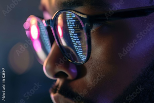Wall mural glasses, coding and reflection with business man reading software development analytics, database an - Wall murals Wall mural glasses, coding and reflection with business man reading software development analytics, database an - Wall murals