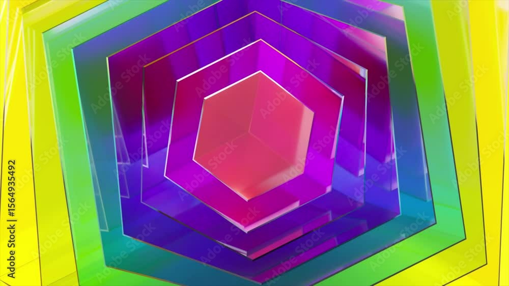 Wall mural glassy hexagonal shapes create a mesmerizing tunnel effect, rotating slightly and shifting colors fr