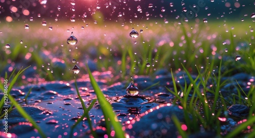 Wall mural : Glistening raindrops falling on lush green grass with a vibrant background creating a serene and ref