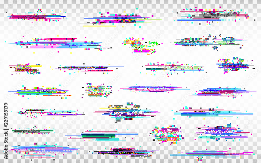Wall mural glitch elements set. color distortions on transparent background. abstract digital noise. error coll