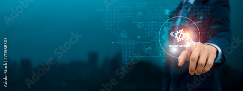 Wall mural : Global business structure of network - businessman touches web development icon on virtual interface,
