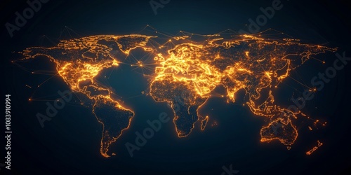 Wall mural : Global city map with luminous data paths connecting regions,space for text