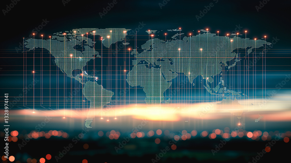 The watermark will not be included on Wall mural.: Global connectivity: a digital representation of the world map illuminated with glowing data points