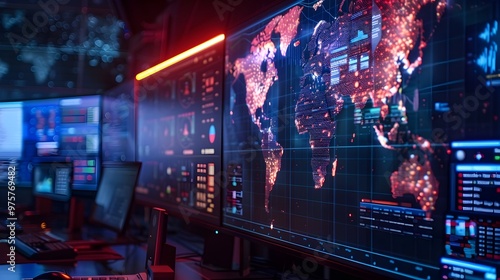 Wall mural global cyberattack and defense visualization in network center - Wall murals Wall mural global cyberattack and defense visualization in network center - Wall murals