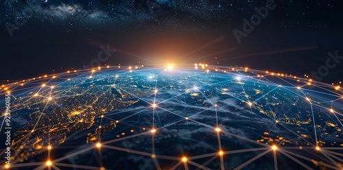 Wall mural global network connectivity on digital world map a digital representation of a world map with glowin - Wall murals Wall mural global network connectivity on digital world map a digital representation of a world map with glowin - Wall murals