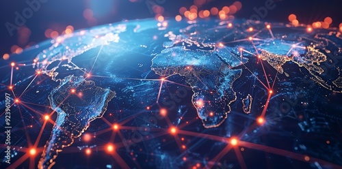 Wall mural global network connectivity on digital world map a digital representation of a world map with glowin - Wall murals Wall mural global network connectivity on digital world map a digital representation of a world map with glowin - Wall murals