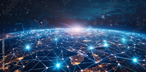 Wall mural global network connectivity on digital world map a digital representation of a world map with glowin - Wall murals Wall mural global network connectivity on digital world map a digital representation of a world map with glowin - Wall murals