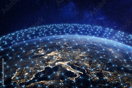 Wall mural : Global telecommunication network above europe viewed from space - internet connection and satellite c