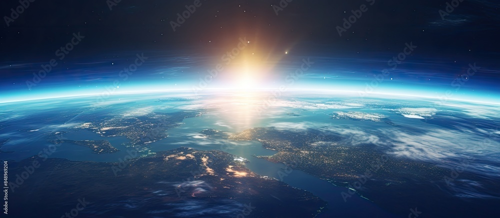 The watermark will not be included on Wall mural.: Global view of planet earth with the sun in the background perfect for copy space image